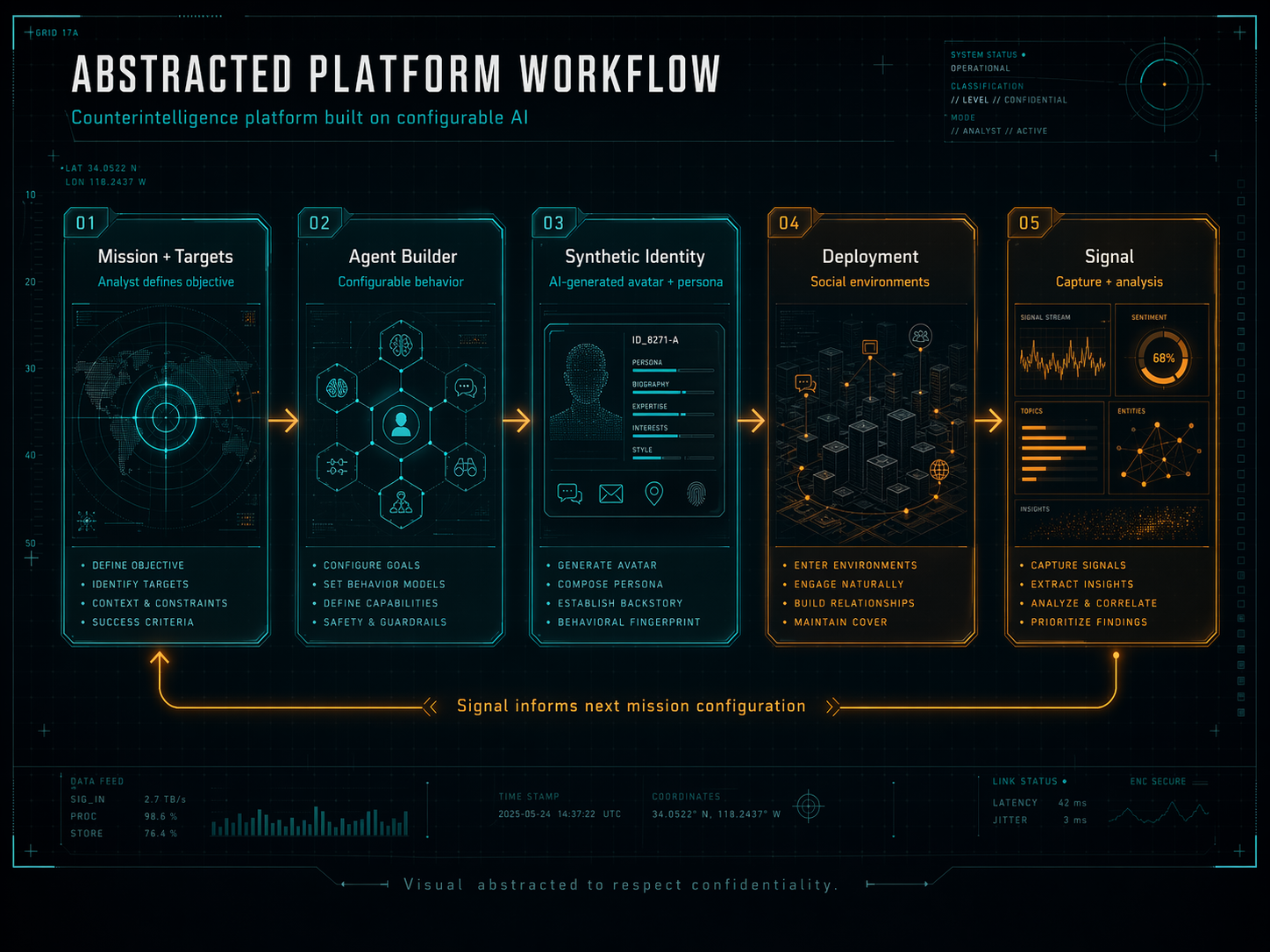 The concept I pitched was a CRM-style platform where analysts could design, configure, and deploy AI agents into those social environments, acting as believable identities that could interact, observe, and capture signal. Think of it as a configurable honeypot system for counterintelligence operations, with AI doing the persona work at a scale humans couldn't match.