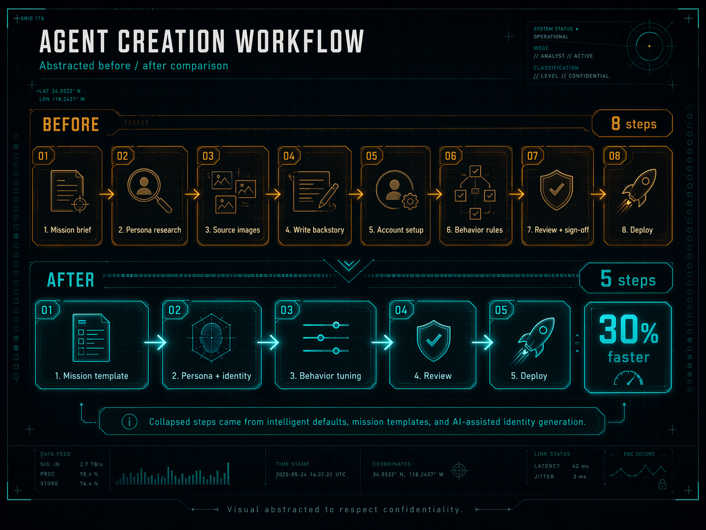 The 30% reduction in agent creation time came from rebuilding the workflow around intelligent defaults, templates for common mission profiles, and AI-assisted generation for the parts of the persona that didn't require analyst judgment (like face generation, name variants, and plausible biographical details). The analyst still drove every decision that mattered, but the busywork collapsed.