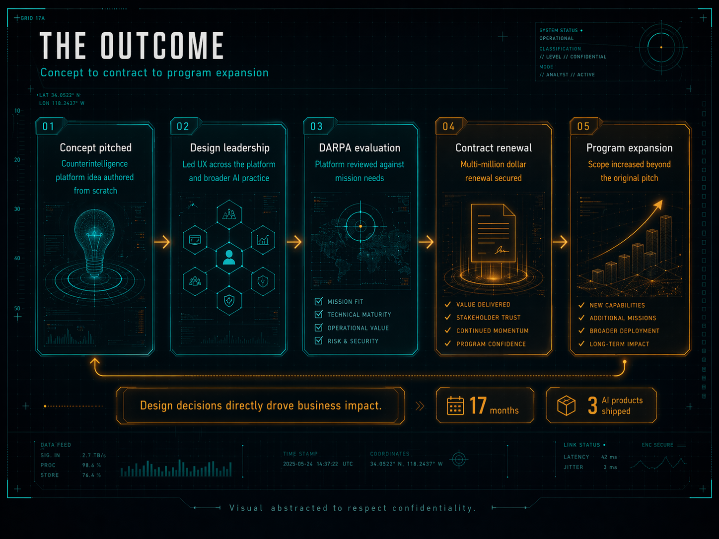 One of those projects drove a multi-million dollar DARPA contract renewal. It started as a concept I pitched. This is the case study for that work, and for the broader AI design practice that grew around it.