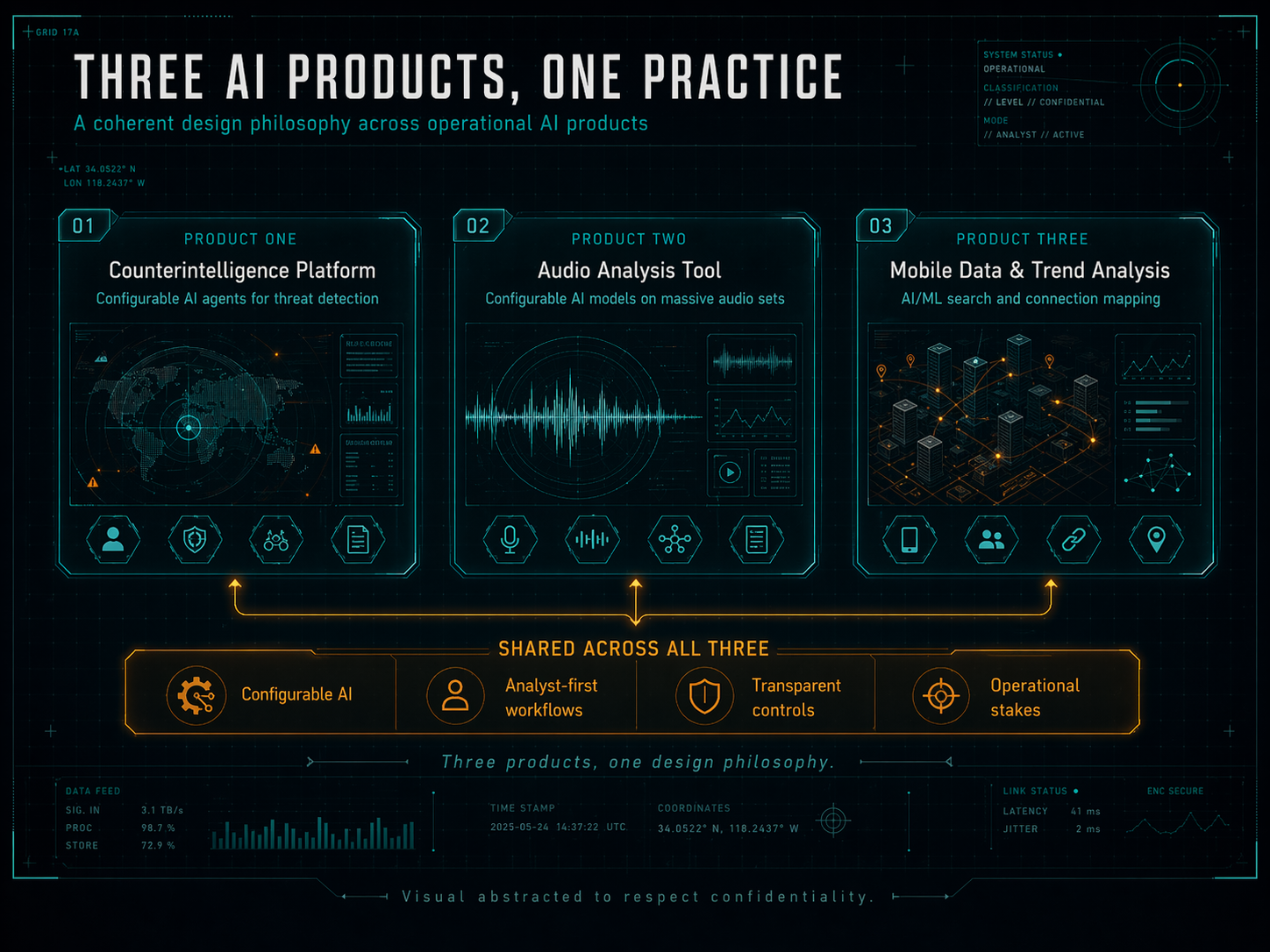 PRODUCT ONECounterintelligencePlatformConfigurable AI agentsfor threat detectionPRODUCT TWOAudio AnalysisToolConfigurable AI modelson massive audio setsPRODUCT THREEMobile Data &Trend AnalysisAI/ML search andconnection mappingShared across all three: configurable AI, analyst-first workflows, operational stakes.Three products, one practice. The common pattern across my AI work at Blue Ridge.